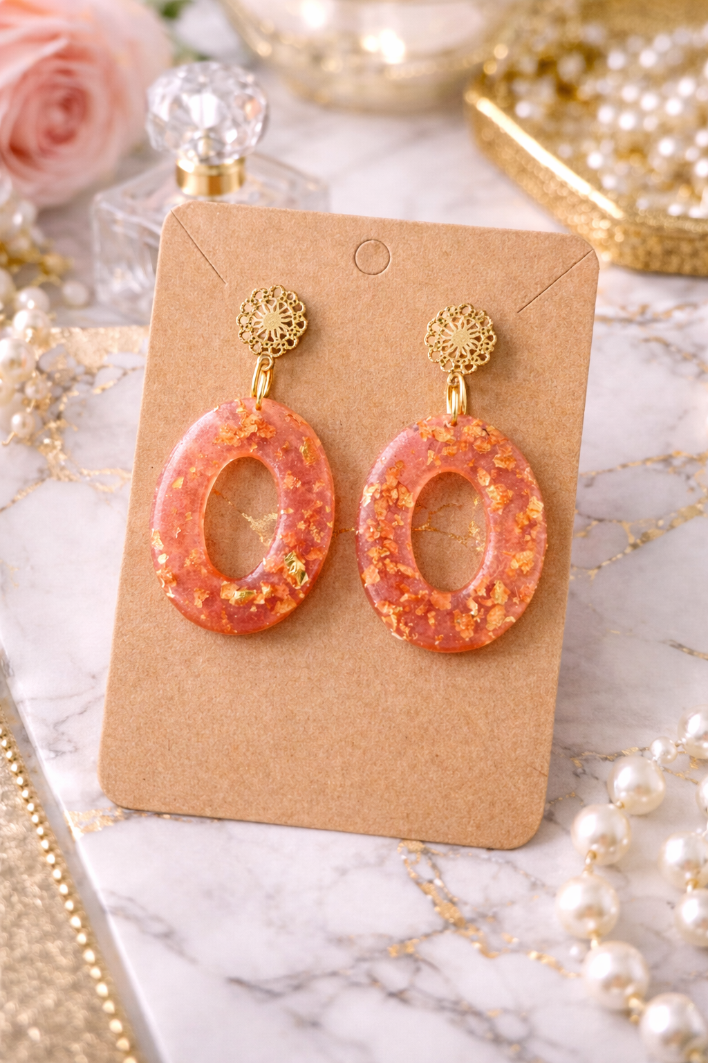 Sublimez votre style avec les boucles d’oreilles “Aurélia”, un bijou raffiné qui allie douceur rosée et éclats dorés scintillants. Leur forme ovale ajourée apporte une élégance moderne, tandis que les inclusions lumineuses captent délicatement la lumière pour un rendu chic et féminin.