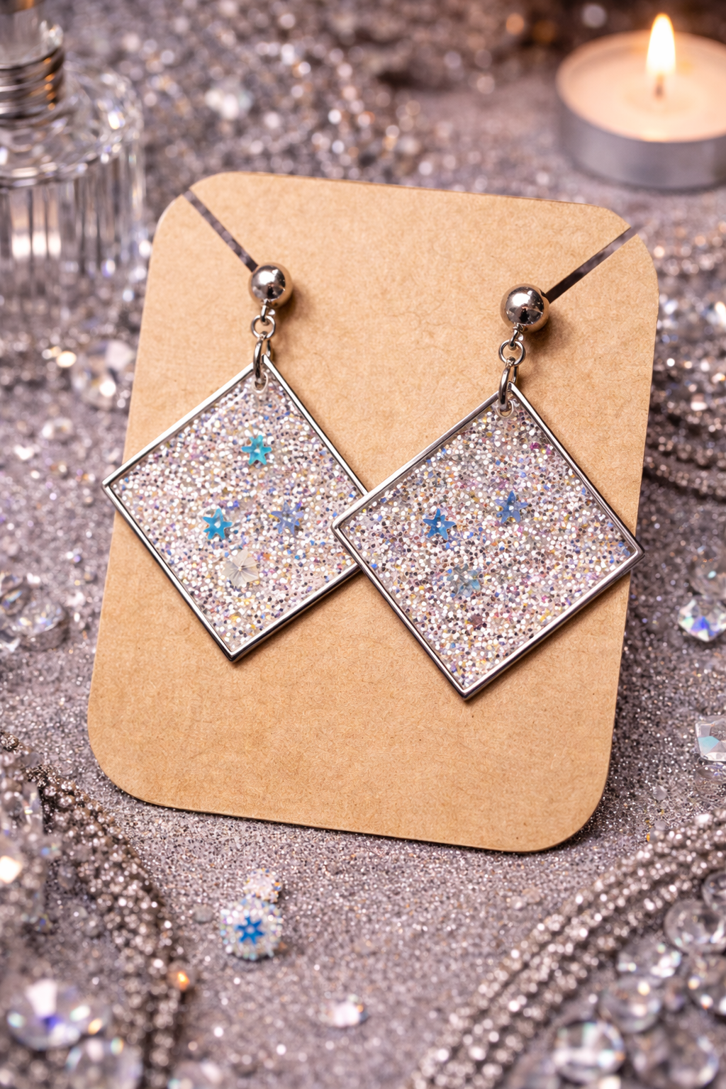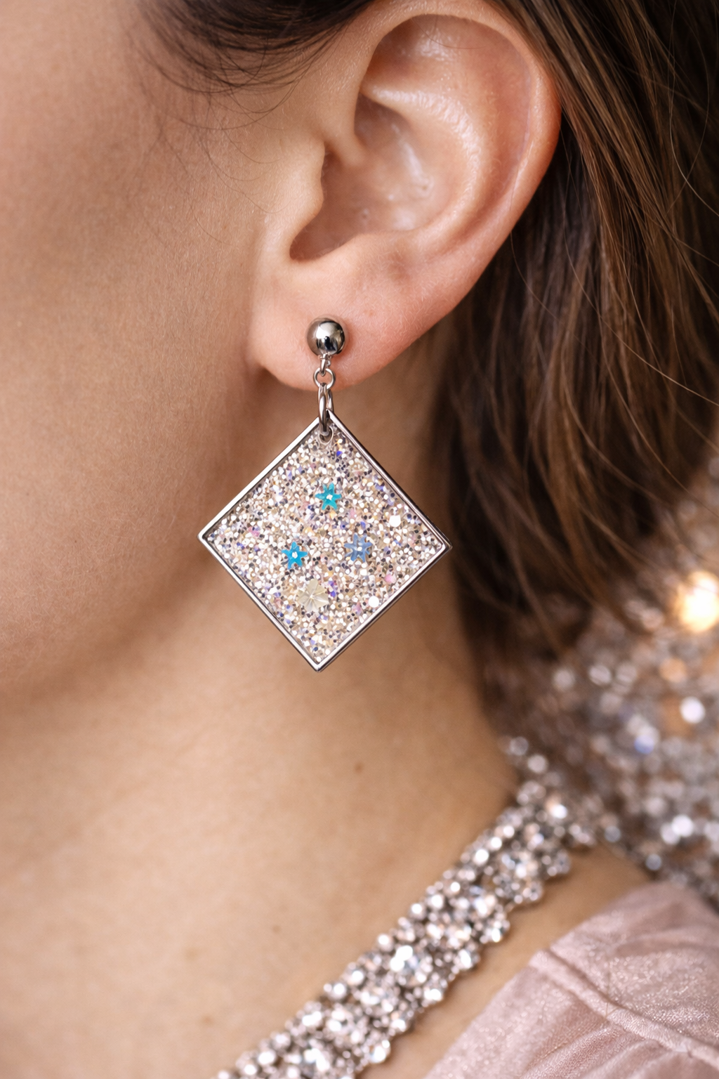 Boucles d’oreilles fantaisie au rendu scintillant façon cristal, évoquant la pureté et la magie de l’hiver. Leur forme géométrique élégante et leurs reflets lumineux rappellent la glace et la neige, apportant une touche raffinée et féerique à votre style.