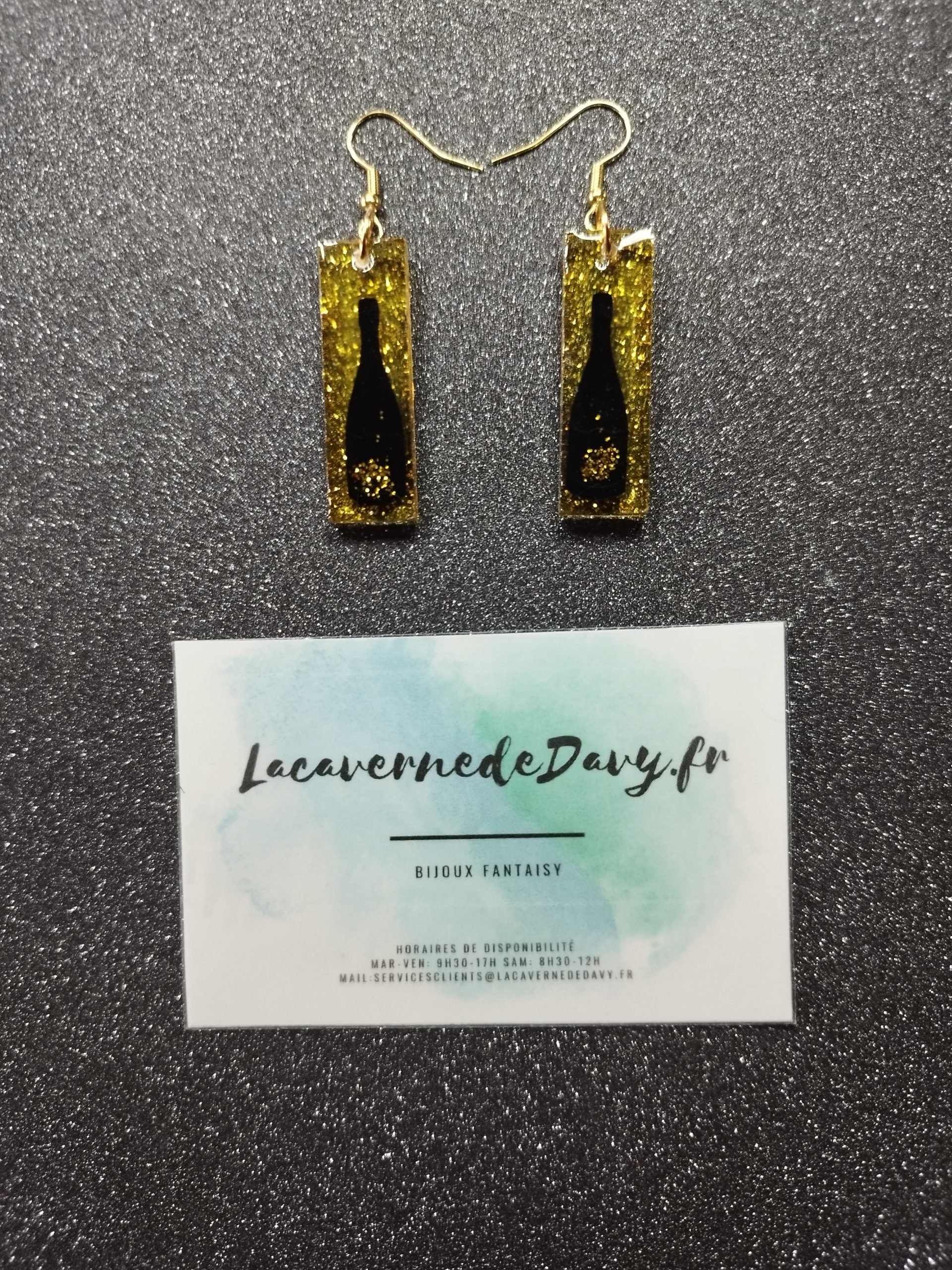 Ces boucles en résine transparente contiennent de fines paillettes dorées qui scintillent à chaque mouvement. Ainsi, elles apportent une véritable dynamique visuelle. Au centre, la silhouette noire d’une bouteille de champagne renforce l’esprit festif du modèle. Ce contraste audacieux entre le noir profond et l’or lumineux crée un style chic, mais aussi très actuel. De plus, leur forme rectangulaire allongée élance la silhouette du visage et ajoute une note particulièrement moderne.