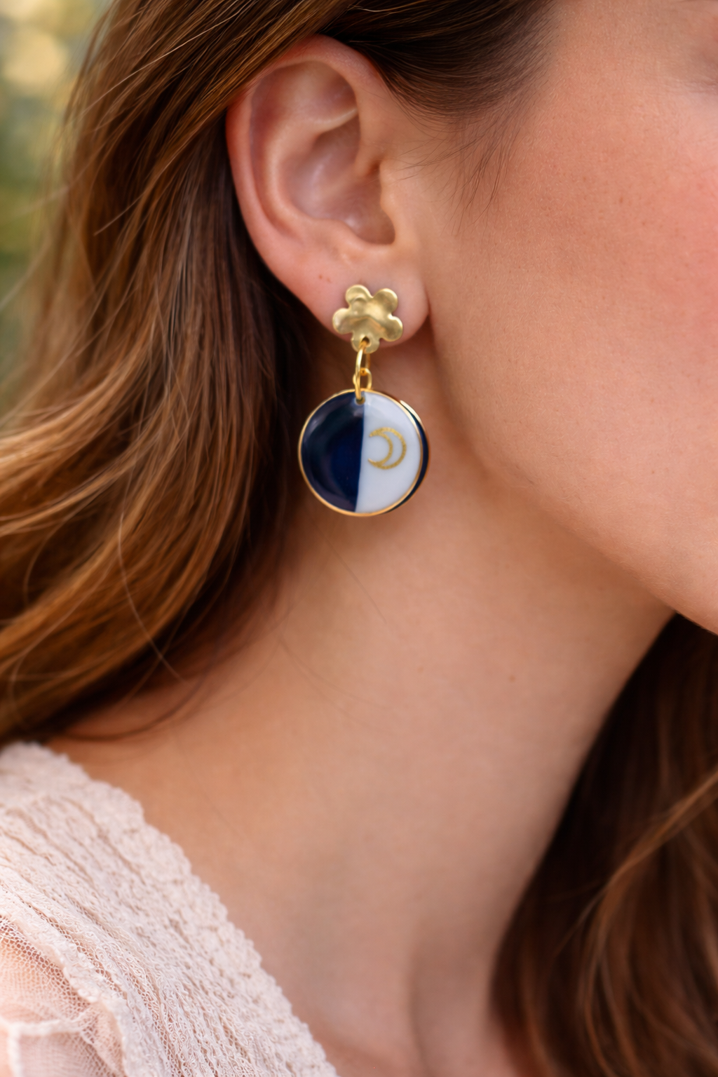 Laissez-vous séduire par les boucles d’oreilles “Clair de Lune”, des bijoux artisanaux inspirés du ciel nocturne. Leur contraste de bleu nuit profond et de blanc lumineux évoque la lumière douce de la lune. De plus, le croissant doré apporte une touche poétique et raffinée.
