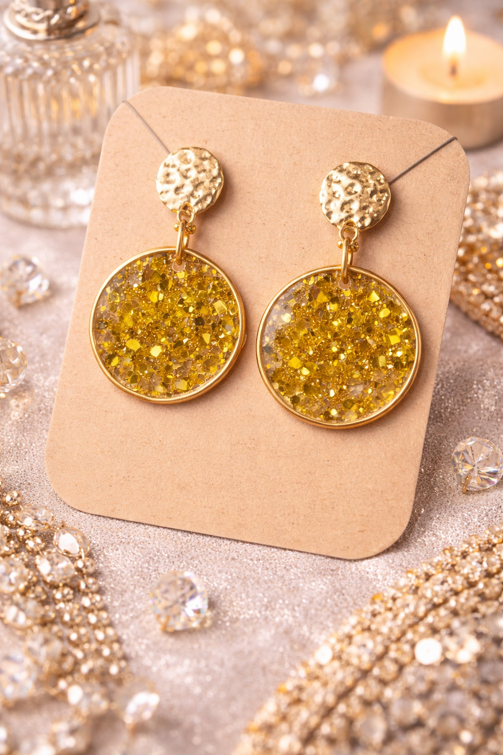 Boucles d’oreilles fantaisie au rendu doré scintillant, sublimées par des reflets lumineux et une finition élégante. Leur design raffiné capte la lumière avec délicatesse et apporte une touche chic et chaleureuse à toutes vos tenues.