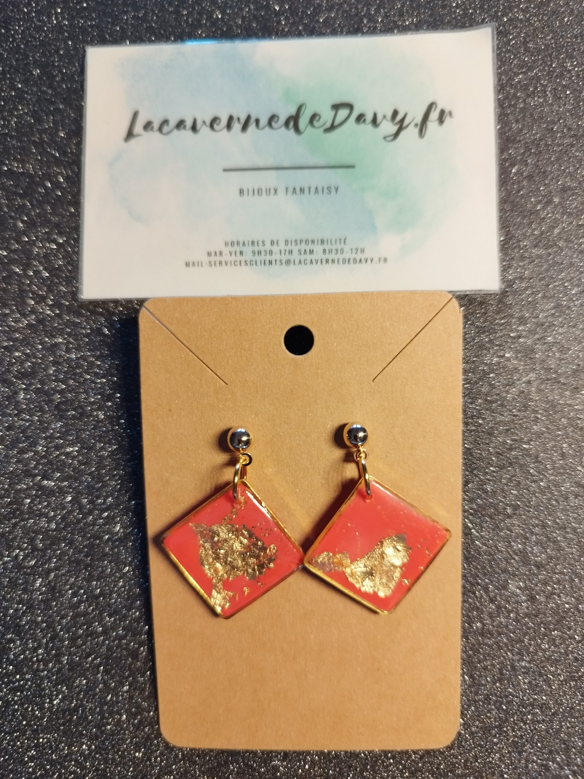 Tout d’abord, leur forme carrée portée en losange donne une allure graphique très tendance. Ensuite, la couleur corail, vive et lumineuse, rappelle les couchers de soleil tropicaux et la chaleur estivale. De plus, chaque boucle est sublimée par de délicates incrustations de feuille d’or, qui captent la lumière avec subtilité. Par conséquent, chaque paire est totalement unique.
