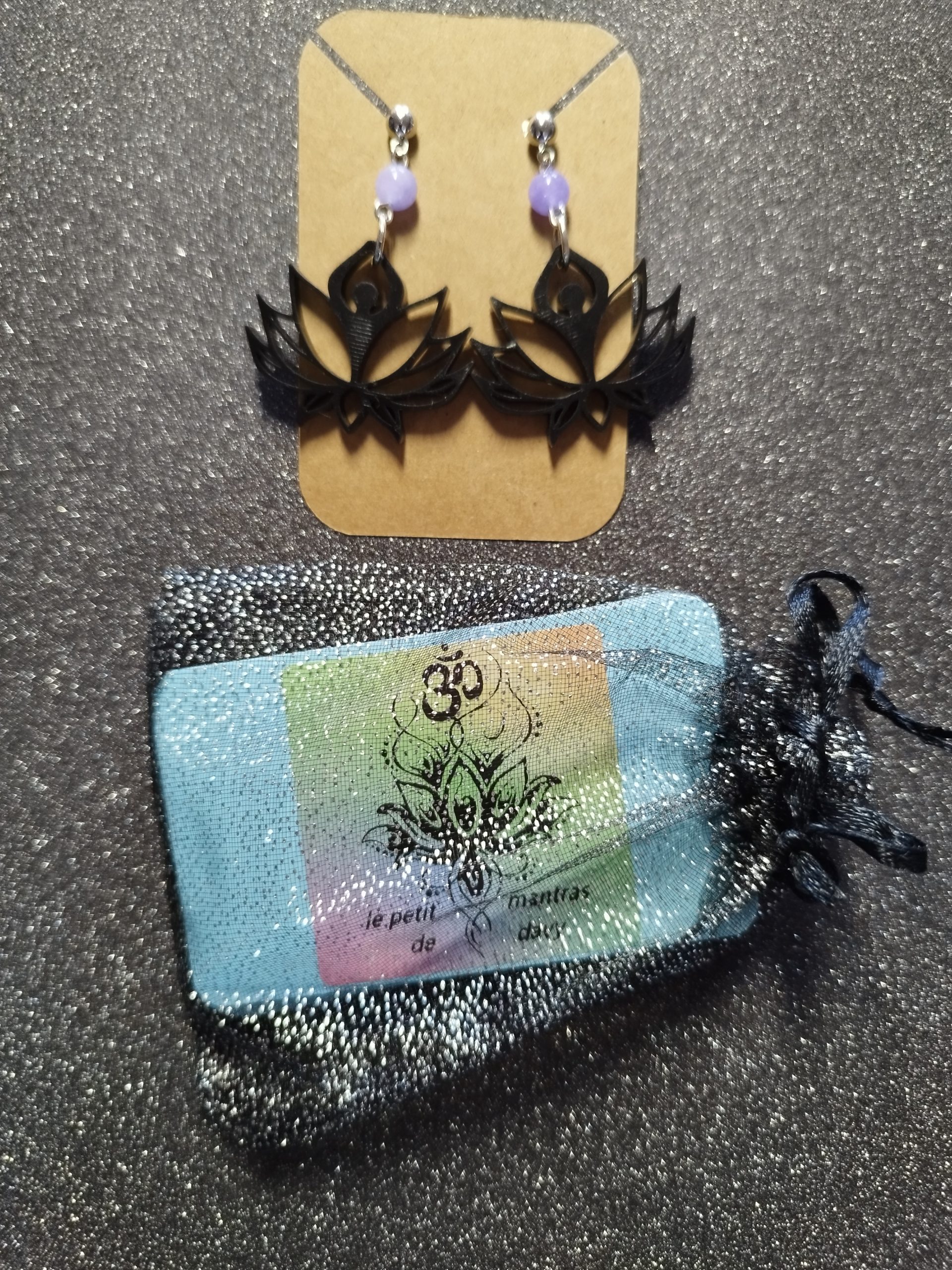 Boucles d’oreilles fleur de lotus avec Lapis-lazuli et Angélite bleu – Pochon de 21 cartes de mantras faits main