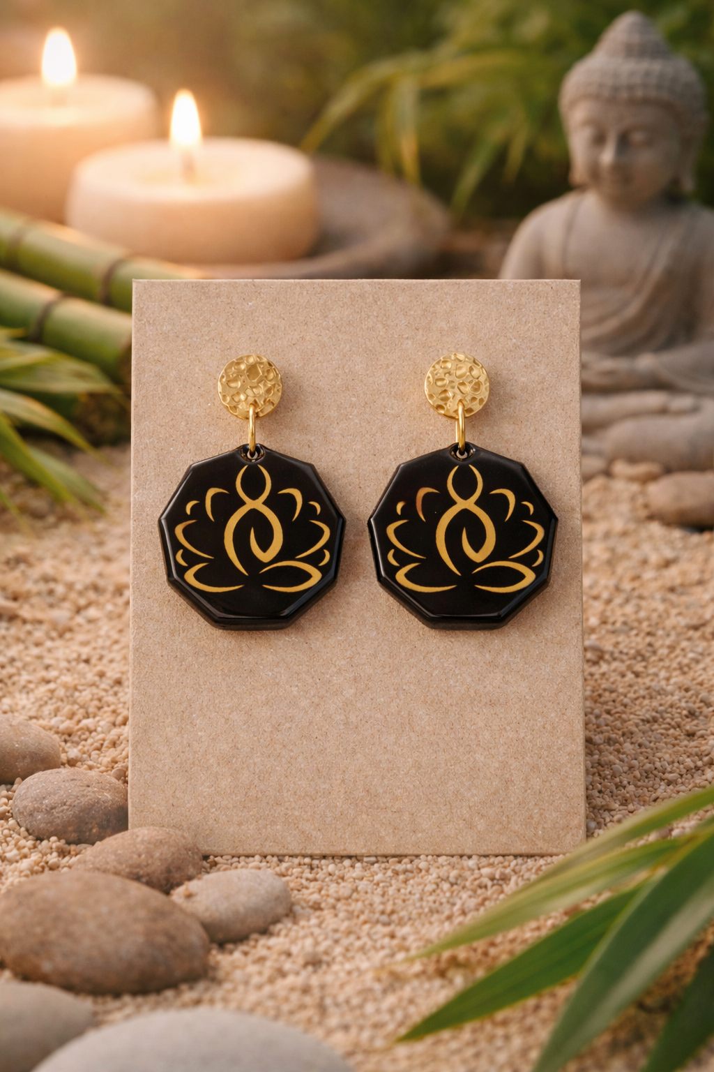Laissez-vous inspirer par ces boucles d’oreilles fantaisie ornées d’une fleur de lotus, symbole puissant de pureté, d’éveil spirituel et d’harmonie intérieure. Leur motif doré délicatement dessiné sur fond noir crée un contraste élégant et apaisant, idéal pour accompagner une démarche bien-être et yoga.