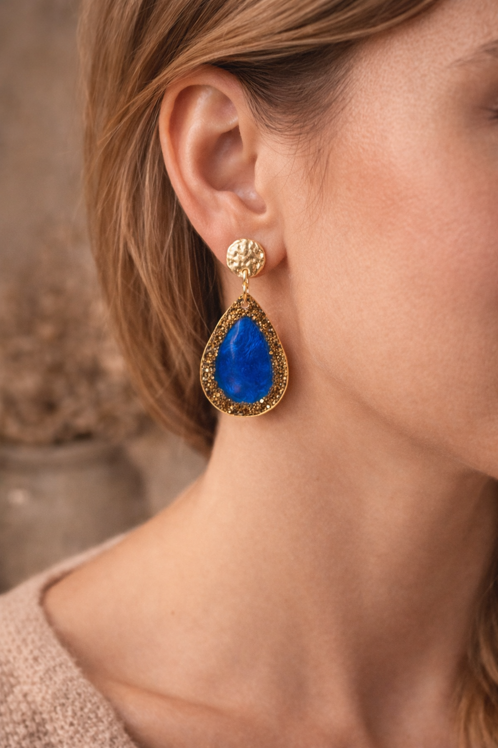 Les Boucles d’oreilles “Lagune Dorée” séduisent par leur contraste harmonieux entre le bleu intense et l’éclat doré. Leur design raffiné évoque la mer, le soleil et la liberté, tout en restant chic et facile à porter.
