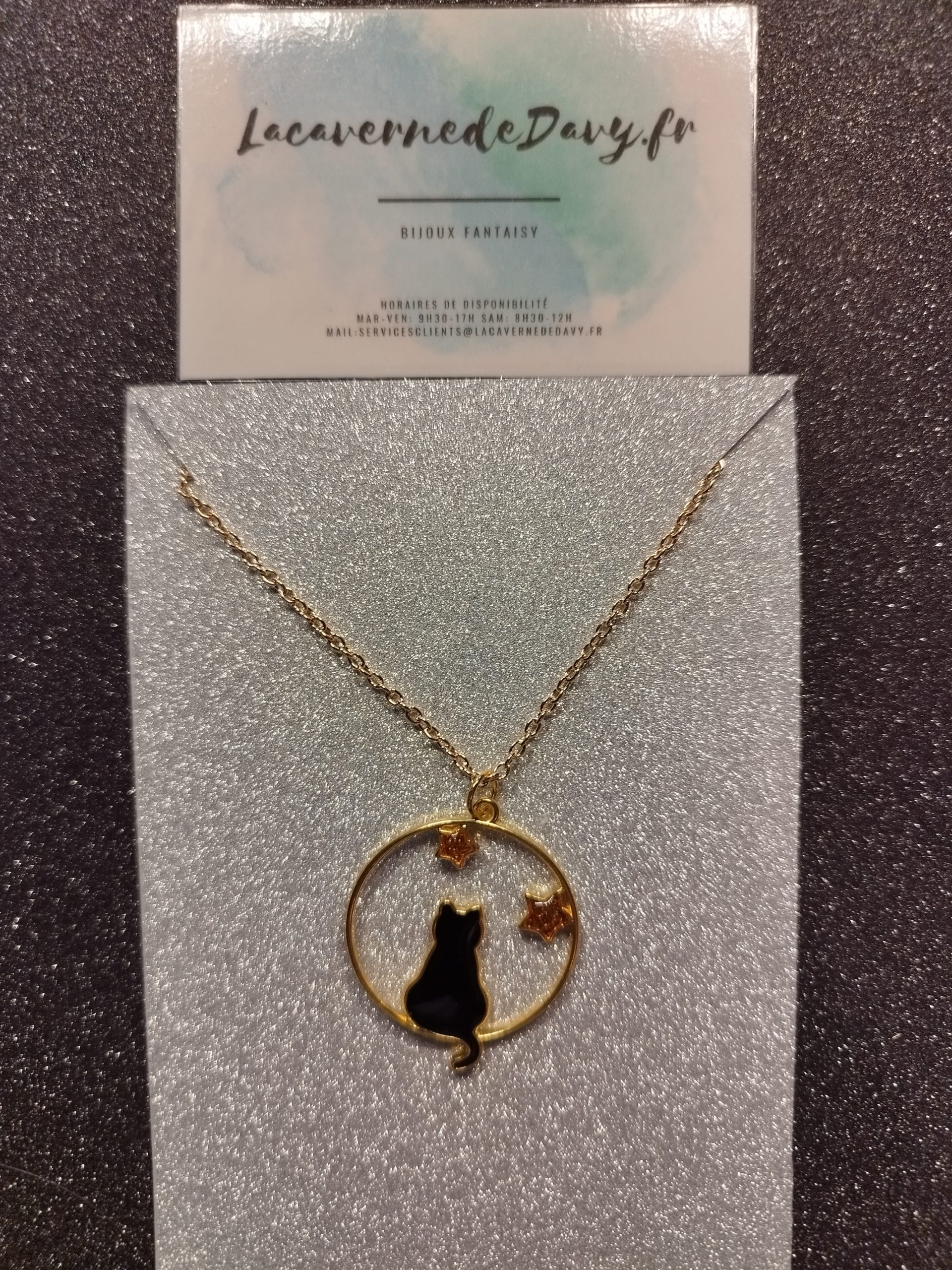 Le pendentif adopte une forme circulaire dorée. Ce cercle symbolise la lune, souvent associée à l’intuition et à la protection. À l’intérieur, une silhouette de chat noir est représentée avec élégance. Le chat semble observer le ciel avec calme. Deux petites étoiles dorées complètent la scène. Elles apportent une touche lumineuse et féerique.