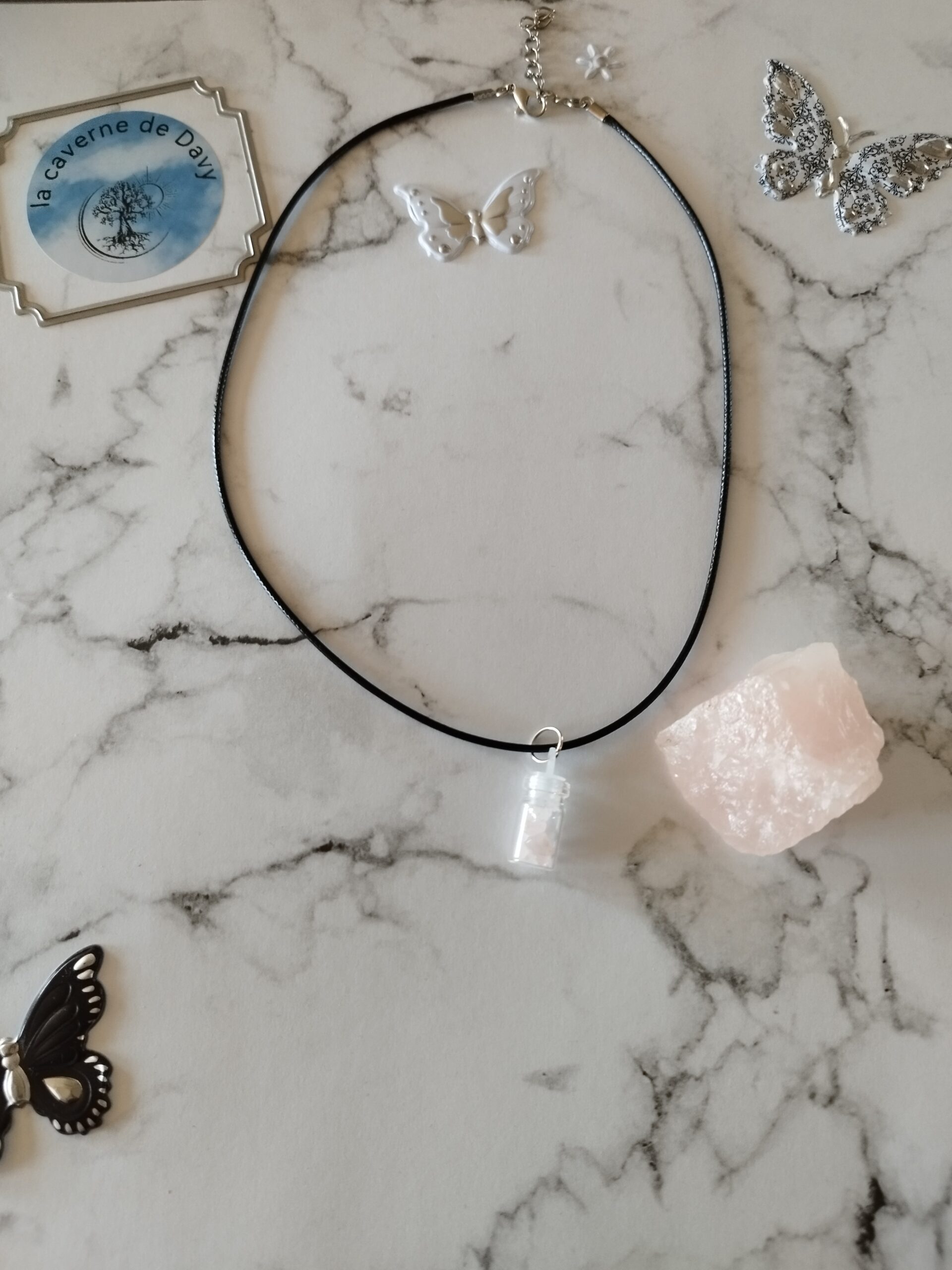Collier fait à la main avec  petites pierre de quartz rose dont les proprieter sont un sentiment de tranquillité et d’amour