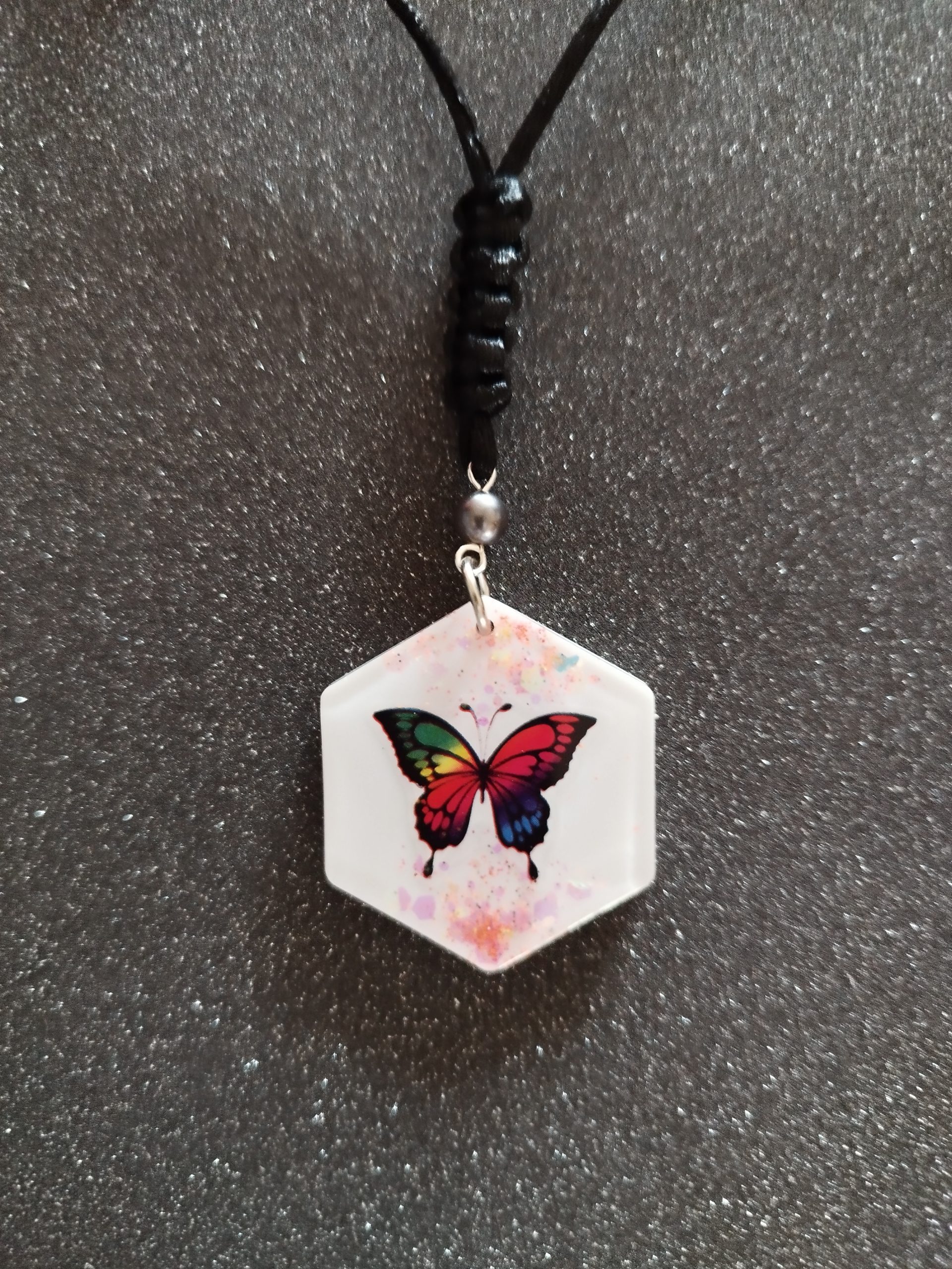 Se pendentif en forme hexagonale met en valeur un élégant papillon aux ailes arc-en-ciel, sublimé par de délicates paillettes scintillantes intégrées dans une résine transparente.