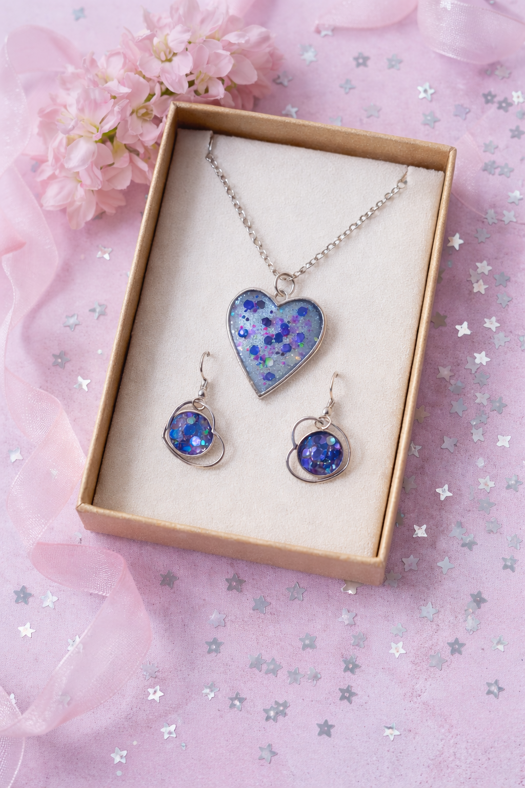 La Parure Cœur Bleu Scintillant est une excellente idée cadeau pour un anniversaire, la Saint-Valentin, ou simplement pour faire plaisir avec un bijou unique et fait main.